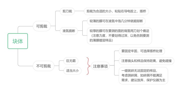 1.塊體樣品。直接可以用導(dǎo)電膠粘在樣品臺上測試,若需拍塊體或者薄膜截面,需明確截面制備方法,一般可以通過剪刀裁剪或者液氮脆斷兩種方式來制備樣品。